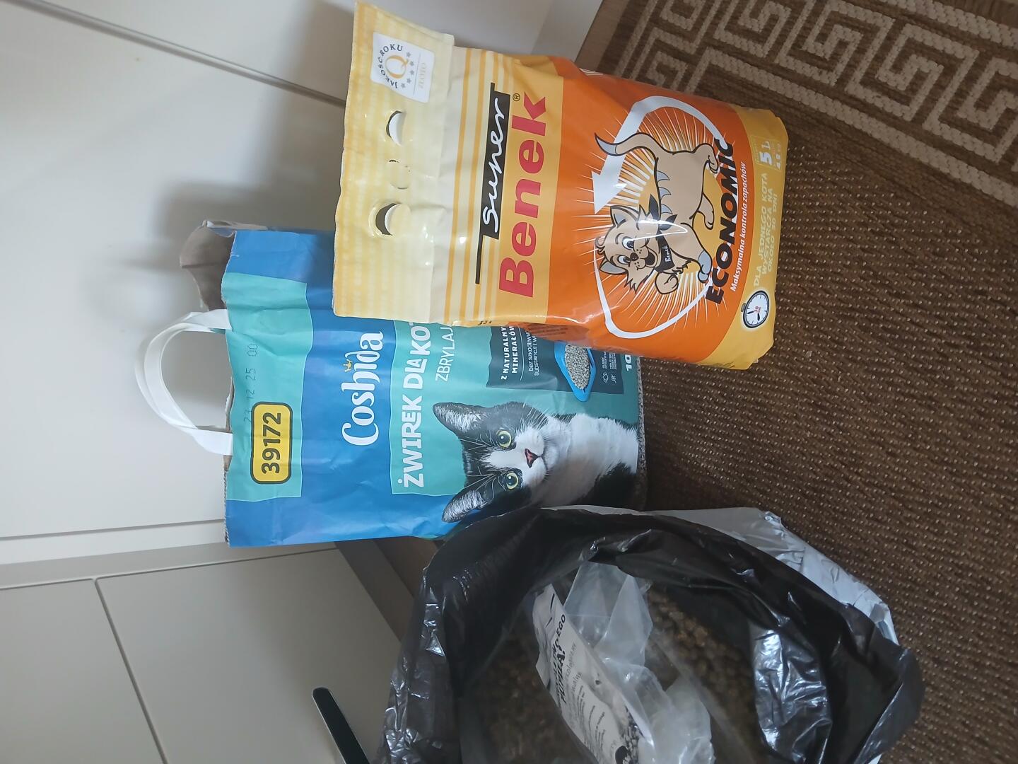 Grajewo ogłoszenia: Żwirek dla kota, opakowanie żółte cale, dwa otwarte.